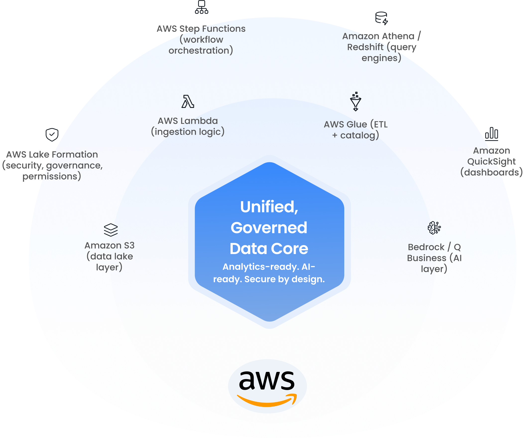 Governance is built into the architecture from day one using Lake Formation, CloudTrail, and related AWS services. Access control, audit logs, and data classification are not separate projects.